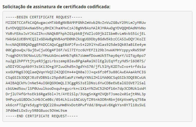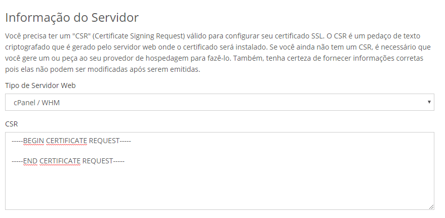 Preencha todas as informações do domínio onde será instalado o SSL e a chave CSR será devidamente gerada, basta então copiar a chave, colar no campo CSR em sua área do cliente selecionando em Tipo de Servidor Web “cPanel / WHM”: